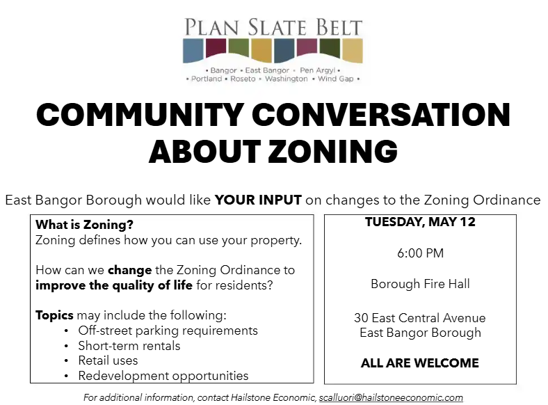 Please join us for a conversation about the zoning ordinance and map on Tuesday, May 12 at 6:00 PM in the Borough Fire Hall, 30 East Central Avenue, East Bangor Borough. If you have any questions, please contact our consultant at scalluori@hailstoneeconomic.com.